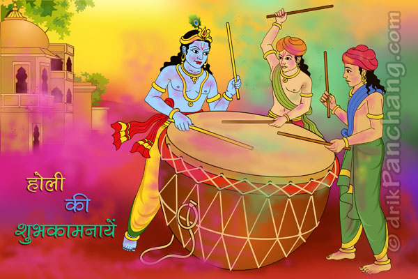 कृष्ण होली के अवसर पर मित्रों के साथ ढोल बजाकर राधा-रानी और गोपियों को होली खेलने के लिये आमन्त्रित करते हुए