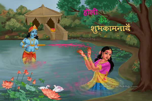 सरोवर में कृष्ण राधारानी पर पिचकारी से होली के रंग डालते हुए